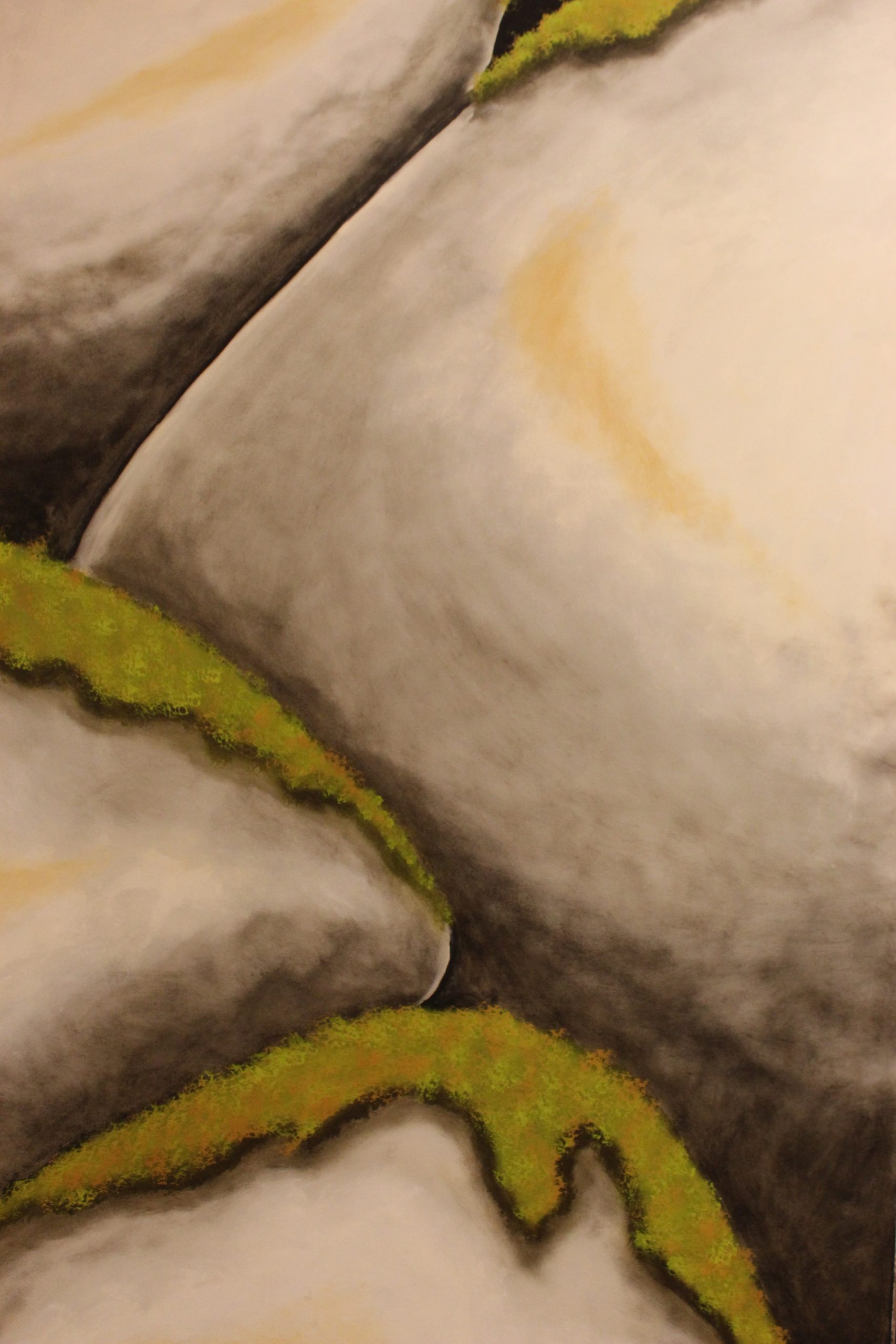 Bilder: Porträtt av Lotta Holmgren samt detalj ur verket Stensäkert, som visas i sin helhet i utställningen.